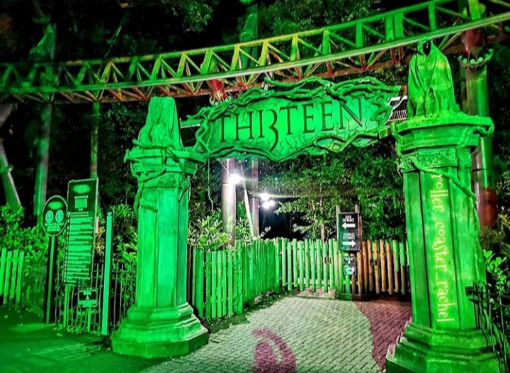 You kept scrolling, I warned you, so lets do this. For all Th13teen’s terrifying ads, it turned out to be an Intamin Family Coaster, at first glance no different from any other family coaster, other than the creepy theming, of course. But Th13teen wasn’t just a family ride. At the end of the relatively tame layout, riders are taken into what looks like an abandoned building, and held stationary for several seconds, before being dropped to a lower segment of track and launched backwards!